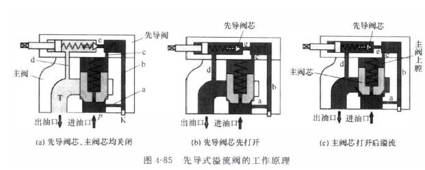 当系统压力等于或大于调压弹簧的预调压力时,先导锥阀先打开[图4-85 (b)], p 来油经阻尼孔a压力降为P1 , 而先导阀前腔经c孔与主阀上腔相通,所以在主阀上、下腔便产生压力差,千是主阀芯上抬,主阀阀口打升.p到T溢流后,p降下来[图4-85(c)]. 使系统压力始终维持在先导调压部分的调节压力。通过调节.改变悯压弹簧的弹力.便能改变进汕腔压力p。