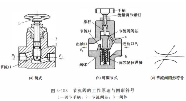图4-153 (b)为可调节流阀的工作原理。与上述简式阀一样,压力油从进油口p, 进入,通过节流口后由出油口P2流出,同样也是用调节手柄调节节流口的大小, 以实现对流扯的调节。