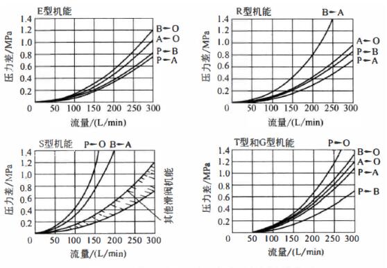 例如图1-9所示为力士乐WEH16型电液动换向阀(E型、R型、S型、T型和G型五个不同中位机能)的特性曲线, 从图中可看出各机能阀两个油口间流动时在不同流员下的压力差。