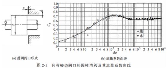 圆柱滑阀的阀口水力直径为圆柱滑阀公式, 雷诺数为雷诺其流扯系数可由图2-1(b)所示的仙线图查得.当仙线图时,其流拭系数C1 =O. 67-0. 74。