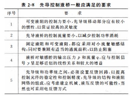 先导式液压控制是液压阀中普遍使用的一种控制原理和方法,其中广泛采用液桥特别是B型液压半桥。从操纵的便捷性、灵敏性、制造及运行的经济性、工作可靠性和稳定性等方面考虑,先导控制液桥一般应满足的要求见表2-8 。