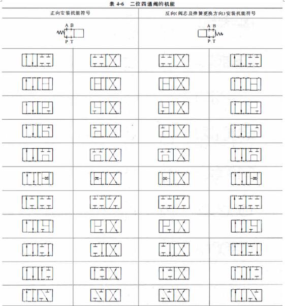 二位四通阀的机能有多种, 如表4-6所示。